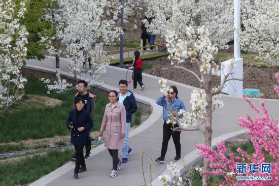 市民在新疆庫(kù)爾勒市賞花游玩(4月9日攝)。新華社記者 丁磊 攝