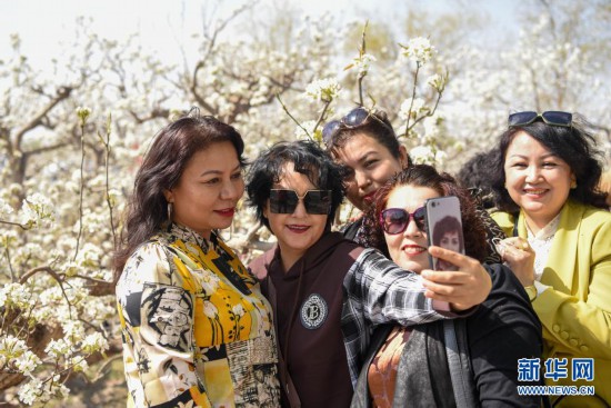 4月10日,游客在新疆庫(kù)爾勒市阿瓦提鄉(xiāng)自拍留念。新華社記者 丁磊 攝