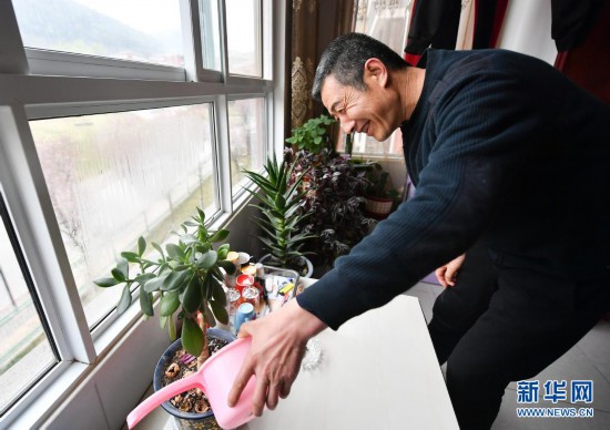 4月20日,在銅川市耀州區(qū)照金鎮(zhèn)移民安置社區(qū),照金村村民馬萬(wàn)長(zhǎng)在家中澆花。