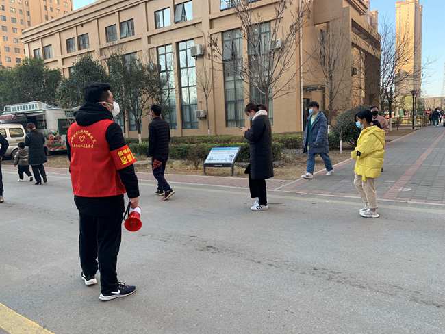 在天福和園社區(qū)5個核酸檢測服務(wù)點都有一大批志愿者積極投身其中,負責(zé)現(xiàn)場秩序的維護和相關(guān)后勤工作。為了避免交叉感染、減少居民排隊時間,志愿者對前來進行核酸檢測的居民進行文明引導(dǎo),提醒大家保持安全距離。同時通過張貼公告、在微信群發(fā)消息、用小喇叭在社區(qū)循環(huán)播放等方式,組織社區(qū)居民按順序檢測,檢測完后不聚集、不交談迅速離開回家。每個角落都能看到身著紅馬甲的志愿者忙碌的身影,盡管防疫志愿服務(wù)可能存在風(fēng)險,盡管天氣寒冷凍的人瑟瑟發(fā)抖,但他們?nèi)匀荒瑘允,懷抱著滿腔的熱情,為居民輸送疫情防控的“安全感”。