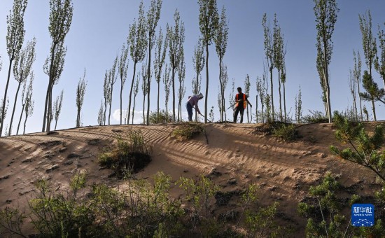 榆林市榆陽區(qū)巴拉素林場的職工在護(hù)理今年新栽的樹苗(6月13日攝)。