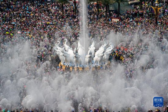 當(dāng)日,云南省西雙版納傣族自治州舉行傣歷新年取水儀式及潑水狂歡,數(shù)萬名各族群眾和游客在景洪市用相互潑水的方式互送祝福、傳遞歡樂。