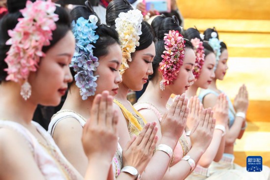 當(dāng)日,云南省西雙版納傣族自治州舉行傣歷新年取水儀式及潑水狂歡,數(shù)萬名各族群眾和游客在景洪市用相互潑水的方式互送祝福、傳遞歡樂。