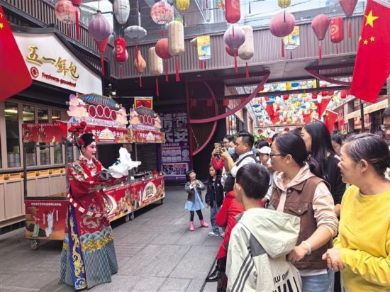 10月3日,在易俗社文化街區(qū),秦腔演員為游客表演經(jīng)典唱段。
