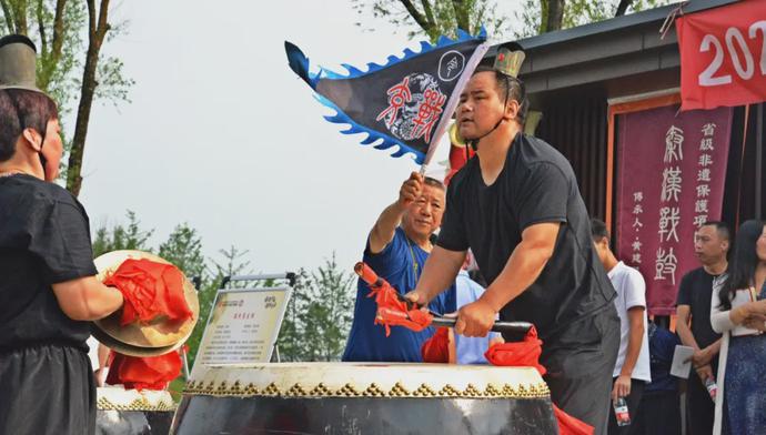 隨后,一場激昂澎湃、跌宕起伏的秦漢戰(zhàn)鼓表演讓現(xiàn)場嘉賓和非遺愛好者親身感受到非遺的獨特魅力。秦漢戰(zhàn)鼓是流傳于秦漢新城正陽街道掌旗寨的鼓樂,傳說由秦始皇掌旗官傳下此鼓,古人作戰(zhàn),戰(zhàn)鼓助威;顒蝇F(xiàn)場,40名鼓手穿戴古代將士服裝組成秦漢戰(zhàn)鼓陣容,主鼓后有秦字大旗,旁邊有數(shù)面副鼓助敲,兩側戰(zhàn)旗飄揚,百面鐃鑼緊隨鼓調起伏。鼓分三部曲,第一部出征曲,也叫慢三火,表現(xiàn)大軍威武雄壯,勢不可擋,滿懷豪情奔赴戰(zhàn)場的情形;第二部交戰(zhàn)曲,也叫緊三火,其調緊鑼密鼓,洶涌澎湃,令人仿佛聽到戰(zhàn)馬奔馳聲,戈戟撞擊聲,戰(zhàn)士吶喊聲,再現(xiàn)了戰(zhàn)場的激烈場面;第三部凱旋曲,也叫不緊不慢再三火,鼓點時而歡樂,時而輕松,表現(xiàn)將士戰(zhàn)場凱旋的喜悅之情,以及對戰(zhàn)爭的思考和對和平的向往。