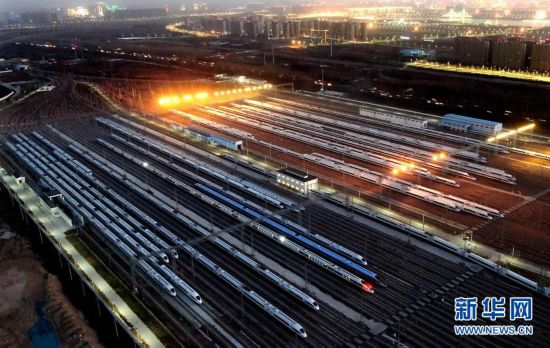 這是?吭卩嵵輺|動車所存車場等待檢修的動車組列車(1月28日攝,無人機(jī)照片)。