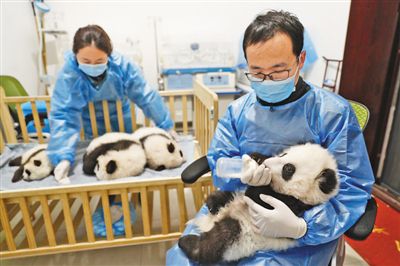 在秦嶺大熊貓研究中心,2020年8月相繼出生的3只雌性大熊貓已經(jīng)半歲,2020年10月出生的一只雄性大熊貓也已滿4個月。經(jīng)過向網(wǎng)友們征名,近日,它們分別被命名為秦韻、秦秀、秦美和秦華。據(jù)秦嶺大熊貓研究中心工作人員張丹輝介紹,現(xiàn)在,它們健康活潑,毛色發(fā)亮,叫聲響亮。