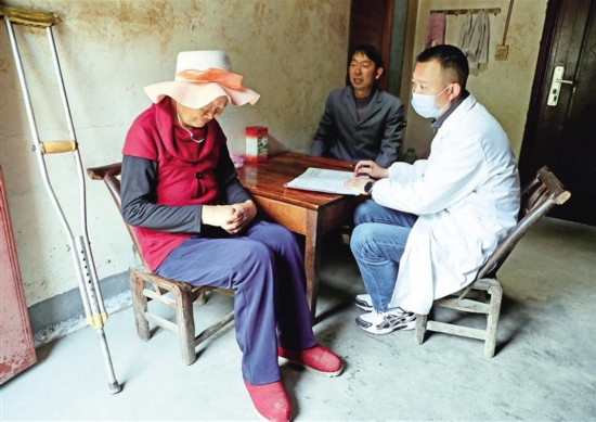 上午10時,木瓜溝村家庭醫(yī)生簽約服務隊隊長鄭傳文上門。按照貧困人口慢性病患者家庭醫(yī)生簽約服務內(nèi)容,鄭傳文為張明琴進行查體,詢問了她近來的身體狀況。除了腦出血后遺癥,張明琴還患有高血壓、糖尿病,鄭傳文將她的血壓值、血糖值一一記錄了下來……