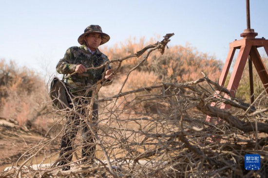 10月11日,護(hù)林員魏存廣在額濟(jì)納旗七道橋胡楊林區(qū)巡護(hù)。新華社記者 李志鵬 攝