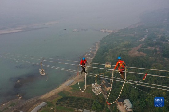 12月5日,在白鶴灘—江蘇±800千伏特高壓直流輸電線路工程(重慶段)江津長江大跨越施工現(xiàn)場(chǎng),工人在長江上空作業(yè)(無人機(jī)照片)。新華社記者 劉潺 攝