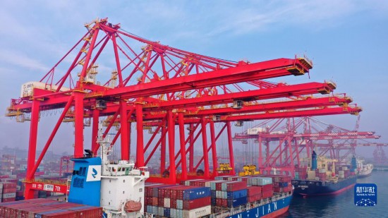 貨輪?吭谏綎|日照港集裝箱碼頭進(jìn)行裝卸作業(yè)(1月26日攝,無人機(jī)照片)。