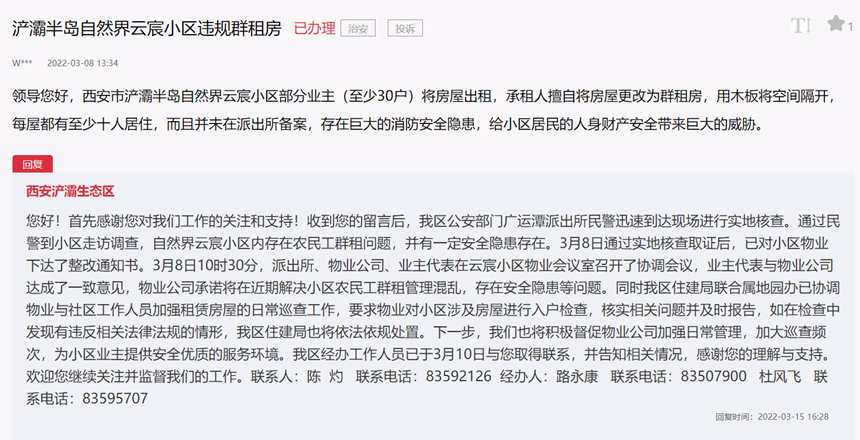 收到留言后,西安浐灞生態(tài)區(qū)回復(fù)稱,區(qū)公安部門廣運(yùn)潭派出所民警迅速到達(dá)現(xiàn)場(chǎng)進(jìn)行實(shí)地核查。通過(guò)民警到小區(qū)走訪調(diào)查,自然界云宸小區(qū)內(nèi)存在農(nóng)民工群租問(wèn)題,并有一定安全隱患存在。