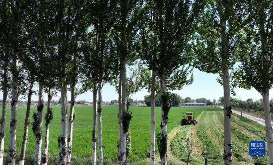 大型農(nóng)機(jī)在榆林市榆陽區(qū)金雞灘村收割紫花苜蓿(6月10日攝)。