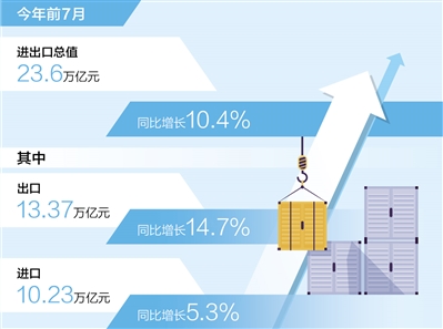 本報北京8月7日電 (記者杜海濤)據(jù)海關(guān)統(tǒng)計,今年前7月,我國進(jìn)出口總值23.6萬億元,比去年同期增長10.4%。其中,出口13.37萬億元,同比增長14.7%;進(jìn)口10.23萬億元,同比增長5.3%。