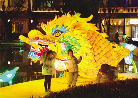 1月30日晚,在西咸新區(qū)灃東新城詩經(jīng)里小鎮(zhèn),游客和花燈合影。 記者 文超攝