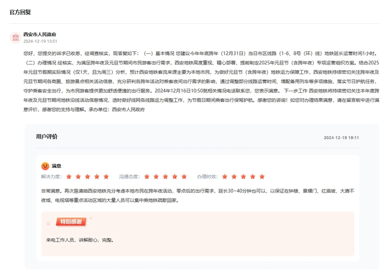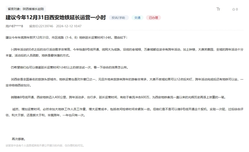 人民網西安12月31日電(記者鄒星)“建議12月31日,市區(qū)地鐵線路延長運營時間1小時,滿足群眾跨年夜零點之后的出行需求。”近日,有網友通過“領導留言板”向陜西省省長留言。